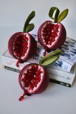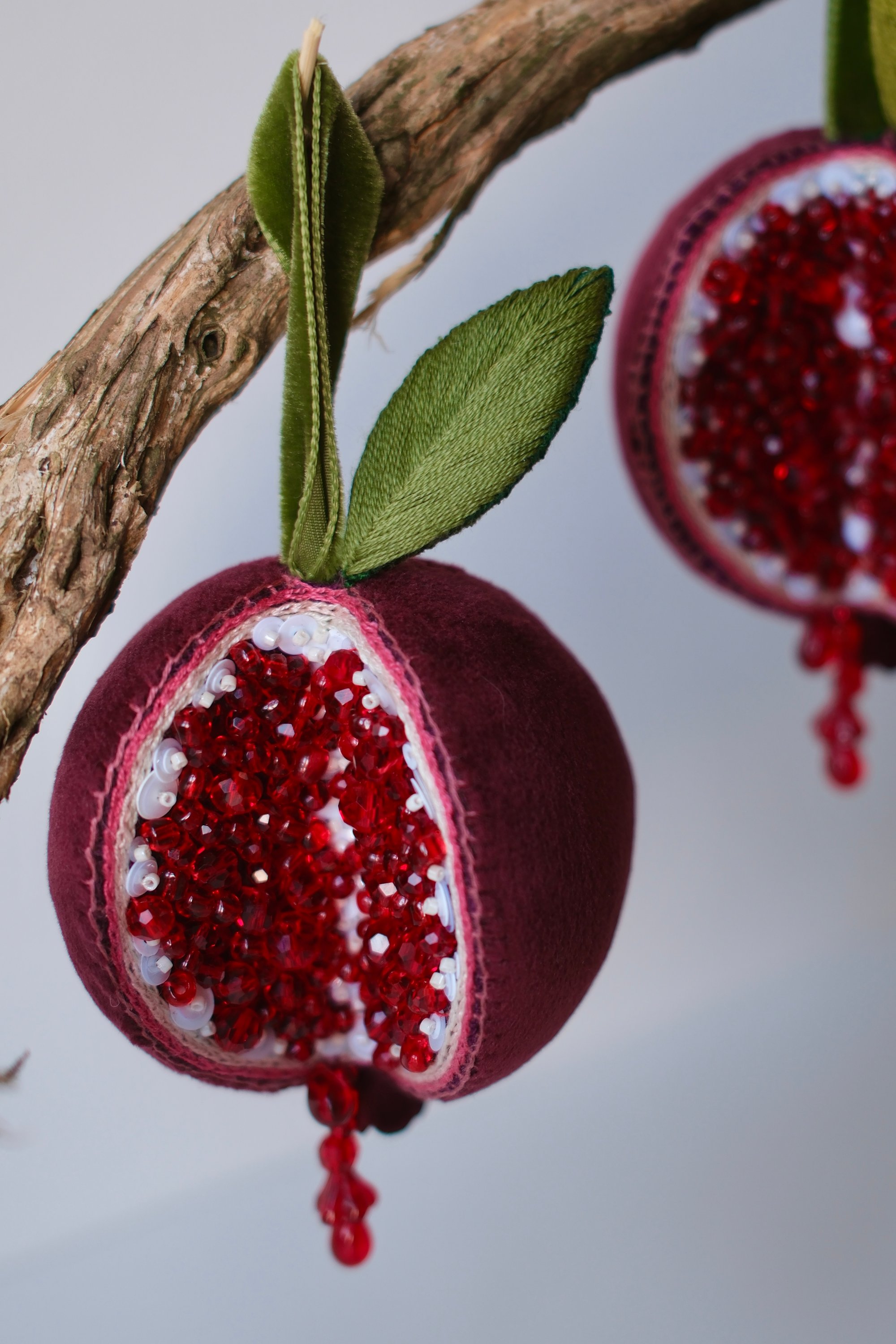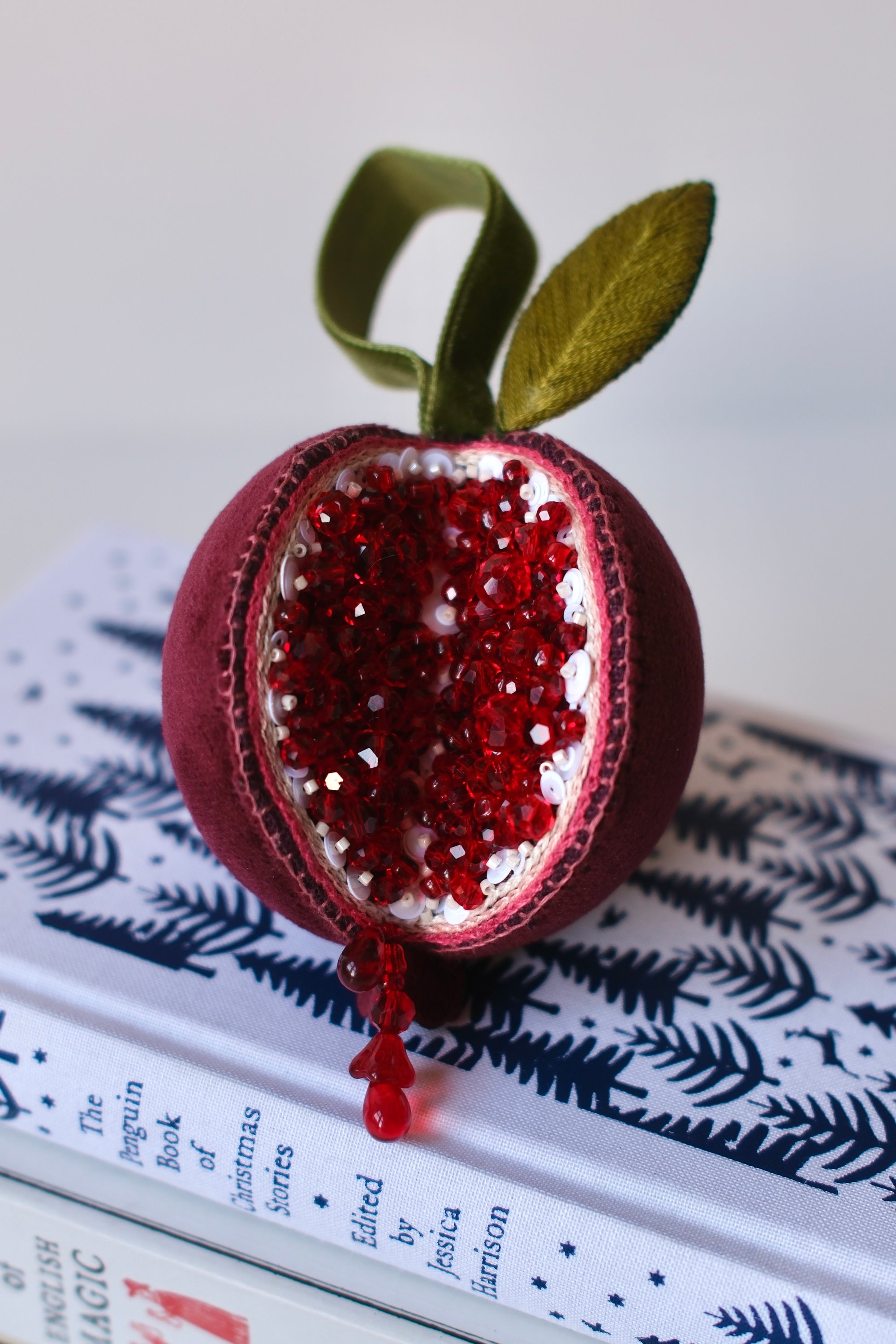 These ornaments are sewn completely by hand. Every bead, stitch, piece of velvet and embroidery lovingly crafted over 10 hours (per pomegranate!)